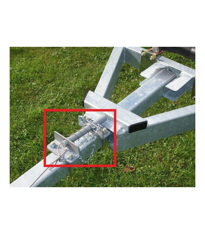 Sluiting voor kantelsysteem, compleet geleverd met veer en pen. Exclusief stroppen; deze zijn in diverse maten verkrijgbaar en afhankelijk van de disselmaten van uw boottrailer.
