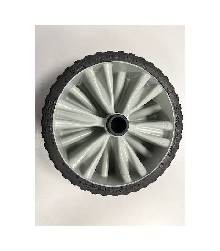 Het massieve wiel is uitgevoerd met een grote grijze kunststof velg, waardoor het bestand is tegen intensief gebruik en niet lek kan raken.